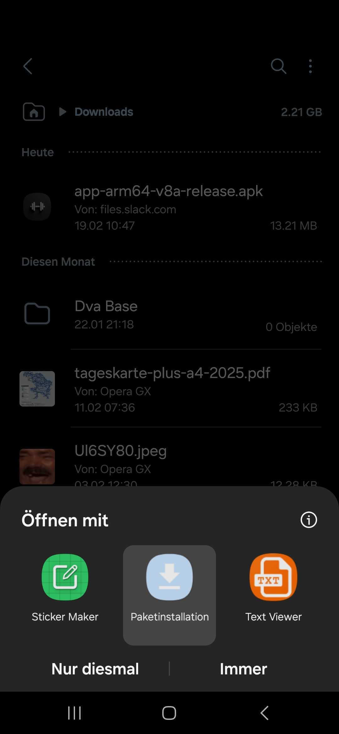 Wähle das Dokument aus und klicke auf die drei Punkte und wähle öffnen mit. Wähle Packetinstalation.